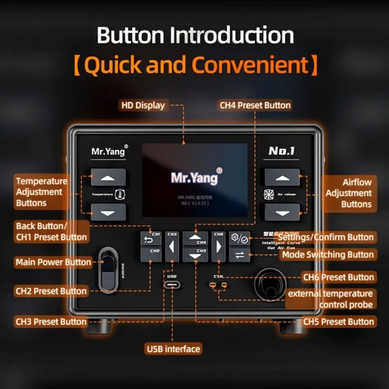 The YCS Mr. Yang No.1 Smart Soldering Station is an all-in-one solution that integrates smart soldering functionality with a curve hot air gun. This innovative design ensures even heat distribution, reducing the risk of overheating or damaging sensitive electronic components.