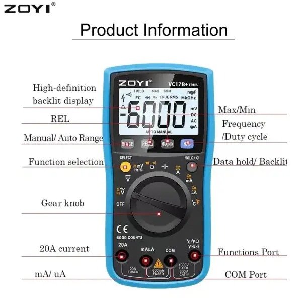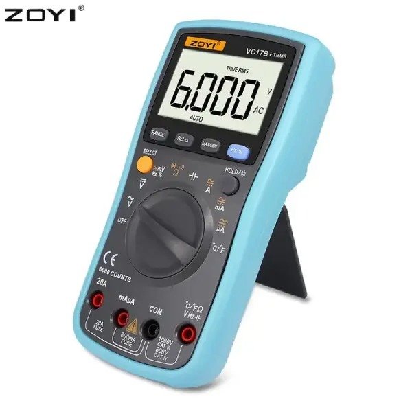 The ZOYI VC17B+ TRMS Digital Multimeter is an advanced measuring instrument designed to meet the needs of technicians, engineers, electricians, and electronics enthusiasts. Offering a combination of accuracy, functionality, and durability, this multimeter is ideal for a wide range of applications, including circuit testing, electronic maintenance, automotive diagnostics, and educational experiments. Built with True RMS technology, a 6000-count high-resolution display, and multiple safety features, the ZOYI VC17B+ delivers dependable performance in both professional and home environments.